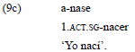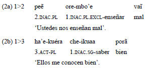 Por el contrario, si la tercera o la segunda persona actúan sobre la primera, o la tercera actúa sobre la segunda, el verbo adopta las marcas del paradigma inactivo para expresar el argumento p, como se observa en el ejemplo 2.