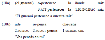 En indagaciones preliminares, se ha observado que la base semántica que subyace al sistema activo/inactivo guaraní es menos transparente en el caso de los préstamos verbales que integran predicados en el guaraní-jopara. De esta manera, verbos que por su aspecto léxico inherente deberían ser indexados con las marcas inactivas (como aquellos que denotan estados, como 'pertenecer', o bien aquellos que denotan procesos no dinámicos, como 'pensar'), adoptan en esta variedad las marcas personales del paradigma activo, tal como se observa en el ejemplo 10.