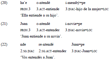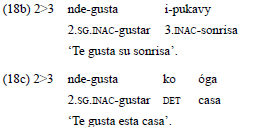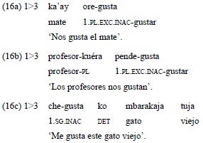 En estos casos, en los que los participantes evocados por el verbo corresponden a la tercera persona gramatical, el rol del experimentante no es expresado en una relación argumental, sino a través de construcciones oblicuas. A diferencia del español, donde los predicados formados por gustar codifican de manera regular el experimentante en la función de P, en guaraní es el alineamiento jerárquico el que determina la codificación de este rol semántico en una relación gramatical. De este modo, cuando la predicación implica participantes que corresponden a una primera o segunda persona, el experimentante es indexado en el verbo, a través de las formas inactivas, y desempeña la función argumental de P. En los ejemplos 16a-c, el estímulo, que corresponde a una tercera persona, actúa sobre el experimentante, que corresponde a la primera persona.