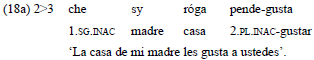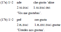 Lo mismo ocurre cuando la segunda persona actúa sobre la primera. En los ejemplos 17a-b, el experimentante es indexado en el verbo como participante inactivo. El estímulo, de segunda persona, es expresado a través de un pronombre libre.