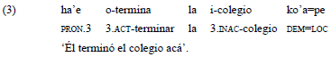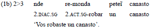 En los predicados bivalentes en los que roles de A y p corresponden a una tercera persona gramatical, opera una jerarquía agente > paciente que determina la codificación del rol de A en el verbo (Velázquez Castillo, 2002, p. 145), tal como se observa en el ejemplo 3.