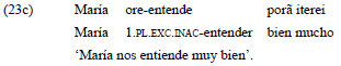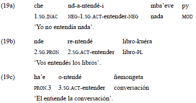 Estas raíces, incorporadas como préstamos al guaraní-jopara, presentan un comportamiento diferente respecto a su funcionamiento en la lengua donante, determinado principalmente por el sistema activo/inactivo que rige las relaciones gramaticales en la lengua prestataria. Los verbos que en guaraní-jopara se construyen con las bases verbales provenientes del español 'entender' y 'gustar' (en interacción con el sistema de marcación activa/inactiva guaraní), codifican los roles semánticos de experimentante y estímulo de diferentes maneras. Así, pueden ser proyectados en función de A, S o p, lo cual constituye diversas estructuras argumentales, tal como se ilustra en el ejemplo 14.