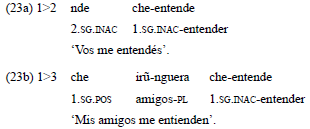 Como en todo predicado bivalente, la jerarquía de persona actúa en la expresión gramatical de los participantes solo cuando el evento implica participantes que corresponden a la primera y segunda persona. En los ejemplos 23a-c, el estímulo, correspondiente a la primera persona, es indexado en el verbo, mediante las formas inactivas, y se proyecta en la función de p.