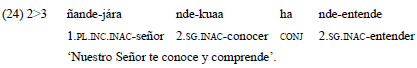 En el ejemplo 24, el experimentante corresponde a una tercera persona y el estímulo a una segunda persona. El participante más alto en la jerarquía, el estímulo, es codificado en el verbo.