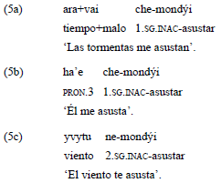 La raíz verbal «mondyi», al igual que «mandu'a», codiica el rol del experimentante en el verbo a través de los preijos inactivos. El estímulo es expresado a través de construcciones nominales o pronombres libres, tal como se observa en el ejemplo 5.