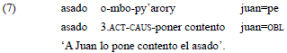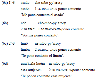 La base verbal «mbopy'arory», por su parte, está integrada por la raíz «py'arory» y el prefijo causativo «mbo-», que en guaraní ocurre con predicados monovalentes. En su variante transitiva, su significado se modifica y es equivalente a gustar (lit. 'poner contento'). En este caso, la codificación de los roles semánticos de experimentante y estímulo también es sensible a la jerarquía de persona que rige los predicados bivalentes. De esta manera, el experimentante se indexa en el verbo, a través de los prefijos inactivos, como argumento p, cuando este corresponde a la primera o segunda persona. Por su parte, el estímulo es expresado en una construcción nominal o a través de un pronombre libre en función de A, como puede observarse en el ejemplo 6.