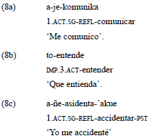 El tipo de construcciones que se analizarán corresponde a predicados verbales formados por una base del español con diferentes afijos guaraníes (prefijos de persona, voz, sufijos de tiempo y aspecto), tal como se muestra en el ejemplo 8.