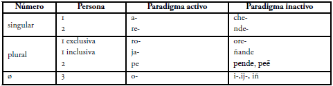 Una de las características morfológicas más relevantes de las lenguas activas/estativas, exhibida por el guaraní, es la presencia de un paradigma de prefijos pronominales, organizados en dos series, activa e inactiva (areales y chendales, según la denominación tradicional propuesta por Guasch, 1996 [1956], p. 114), que a nivel sintáctico evidencian la escisión o split en la codificación del único argumento de las cláusulas intransitivas, identificado como s1.