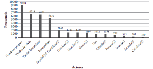 En la Figura 1, se aprecia la frecuencia de las palabras usadas para representar a los colonizadores europeos. El uso de nombres propios es la forma de más alta frecuencia utilizada [9078]3, los conquistadores son individualizados e identificados con nombres propios. Las palabras que designan títulos de oficio [7085] y honoríficos [6431] tienen altas frecuencias (más de 6000) en la representación de los colonizadores. La frecuencia de los pronombres [5113] es alta, en especial de yo y nosotros, porque los cronistas-protagonistas en el «descubrimiento» y la «conquista» se representan como héroes y sujetos egocéntricos. Se utilizan algunas formas de categorización relacionadas con el lugar de procedencia (españoles y castellanos [2042]), la filiación religiosa (cristianos [1442]), la filiación personal (hombres [1221] y gente [1148]). Otras representaciones significativas son: Dios [1000], deidad suprema de los cristianos; caballos [1000], un medio importante para las empresas de los europeos; armada [300], representada a veces como un actor con rasgos humanos; finalmente, los actores personas [446], señores [543] y caballeros [219] con baja frecuencia de aparición.