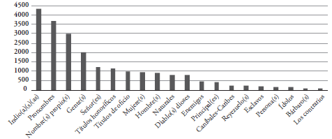 La Figura 2 contiene la representación de los actores colonizados. La nominación indios es la de mayor frecuencia [4559]; la nominación con pronombres personales [3139] tiene una frecuencia significativa. Estos datos demuestran que los «indios» no son identificados como individualidades, personalidades bien definidas, pues su nominación con nombres propios es de 3013, menor que las dos frecuencias anteriores. La representación con gente [2000], la nominación señores [1229] y la representación por títulos honoríficos [1156] son menos significativas que las representaciones de los colonizadores, porque los pueblos prehispánicos, como personas, representaban poco para los colonizadores europeos. La nominación con títulos de oficio alcanza una frecuencia de 1000. De esto, se deduce que los oficios y funciones no fueron una temática muy significativa para los cronistas.