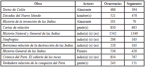 El corpus para la descripción de los actores está constituido por diez crónicas escritas entre 1492 y 1555, periodo que corresponde al «descubrimiento» y «conquista» de América. Las obras son: Textos y documentos completos. Relaciones de viajes, cartas y memoriales de Colón ([1492-1506] 1982); Décadas del Nuevo Mundo de Mártir de Anglería ([1516] 1964); Cartas de Relación de Cortés ([1519-1526] 2005); Historia de la invención de las Indias de Pérez de Oliva ([1528] 1991); Historia general y natural de las Indias, primera parte, de Fernández de Oviedo ([1535] 1851); Historia General de las Indias de López de Gómara ([1552] 1979); Naufragios de Núñez Cabeza de Vaca ([1542] 1998); Verdadera relación de la conquista del Perú de Xerez ([1534] 1891); Crónica del Perú. El señorío de los incas, primera parte, de Cieza de León ([1553] 2005), y Brevísima relación de la destrucción de las Indias de Las Casas ([1552] 2007). Las temáticas centrales de estas obras son los hechos referentes al «descubrimiento», la «conquista» y colonización del Nuevo Mundo por los colonizadores europeos.
