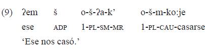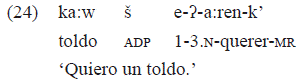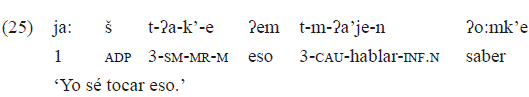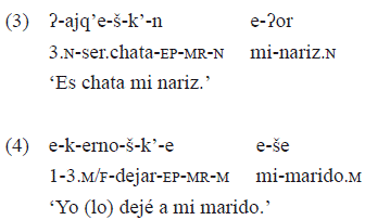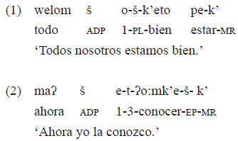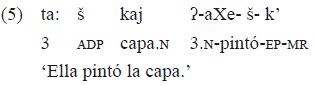 Como se puede observar, S y A se hallan marcados facultativamente por la misma adposición «š» frente a O que no está marcado: S = A ≠ O. Este sistema coexiste con un subsistema ergativo-absolutivo que se encontraba en proceso de retracción al momento de describir la lengua, en tanto que el primer sistema se iba imponiendo, tal como pudo comprobarse a partir de la comparación de textos de distintas épocas (Fernández Garay, 2007, pp. 122-124). El subsistema ergativo-absolutivo se manifiesta en los verbos del Grupo 1 que concuerdan en género con S cuando son intransitivos, y con o cuando son transitivos, en tanto que S/A pueden presentar la marca adpositiva mencionada, dado que esta es facultativa. La concordancia de los verbos del Grupo 1 se produce por medio de los morfemas «k- ~ ʔ-/Ø-6» («k-» concuerda con sustantivos masculinos o femeninos; y, ʔ-/Ø -» con sustantivos neutros); además, en los verbos del Grupo 1 el objeto es el argumento obligatorio de la frase verbal.