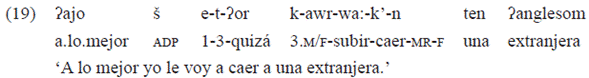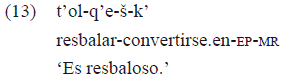 En el siguiente ejemplo, encontramos el verbo «t'ol» ('resbalar') y la forma «q'e» que hoy no hemos podido documentar como forma independiente: