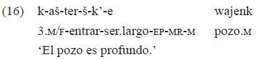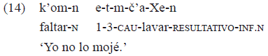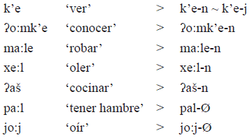 A partir del ejemplo 13, pensamos que debe haber existido un verbo «q'e» ('volverse' o 'convertirse en') que se gramaticalizó y que hoy no existe como lexema verbal. Lo mismo ocurre con «-Xe-» sufijo con valor «resultativo», que posiblemente derive de un verbo que no fue documentado como morfema libre.