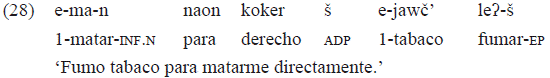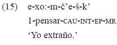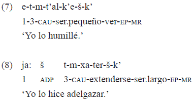 En el ejemplo 14, lo vemos ya convertido en un sufijo resultativo, y como tal lo encontramos en los siguientes casos: «meʔq-Xe» ('retorcer (lana)-resultativo') que da como resultado 'hilar'; «m-wes-Xe» ('causativo-ser filoso-resultativo') da por resultado 'afilar'. En el ejemplo 15, volvemos a la construcción que vimos más arriba: