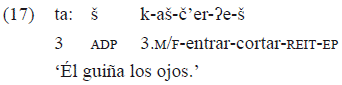 En el ejemplo 17, el verbo « č 'er» ('cortar'), verbo transitivo, se une nuevamente al verbo 'entrar' para generar una base transitiva, que además incluye el afijo reiterativo proveniente del verbo 'llegar, venir':
