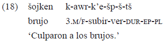 En el ejemplo siguiente, encontramos el verbo transitivo «-awre» ('montar, tocar') que se une al verbo transitivo «k'e» ('ver') para originar la base transitiva «-awrk'e» ('culpar').