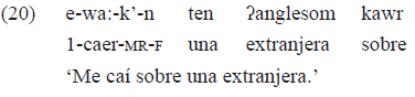 Verbos como «ʔašeʔ» ('entrar'), «-awre» ('subir, montar'), que conforman CSV, van a gramaticalizarse y desprenderse como posposiciones: «-aš» ('en'), «-awr» ('sobre'), «-aj» ('en, mientras'), «-eno» ('junto a'), etc. Algunas de dichas posposiciones darán como resultado un aplicativo, que tiene como finalidad transformar un argumento periférico en un objeto, aumentando la valencia verbal. En el ejemplo 19, vemos que «-awr» ('sobre, encima') se aplica a «wa:» ('caer'), verbo intransitivo para dar un verbo transitivo: