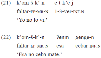 Algunos verbos exigen la presencia de una forma no finita que depende de los mismos. Así, estos infinitivos pueden depender de un verbo de manera directa. Un caso interesante es el de la negación que se realiza por medio del verbo «k'om» que significa 'faltar, no haber', uno de los verbos negativos de esta lengua, que se emplea generalmente en su forma finita, y del que depende una forma no-finita que expresa la proposición que se niega y funciona como el argumento sujeto: