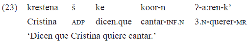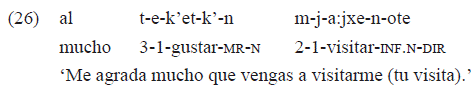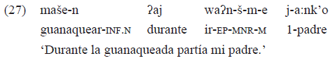Tanto en el ejemplo 25 como en el 26, los infinitivos están determinados por personales que funcionan como argumentos del verbo no-finito, núcleo de la cláusula subordinada; incluso, en la primera aparece un prefijo causativo y en la segunda un sufijo direccional, ambos elementos que caracterizan el sintagma verbal. A diferencia de las cláusulas argumentales, en las que el infinitivo determina directamente al verbo principal, en las cláusulas adverbiales aquel es introducido por medio de elementos funcionales, en estos casos, posposiciones. Las cláusulas adverbiales pueden tener valor temporal: