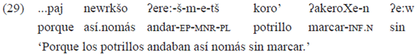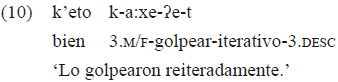 El ejemplo anterior muestra el verbo «-a:xe» ('golpear'), seguido del sufijo aspectual con valor iterativo «-ʔe», que proviene del verbo de la misma forma que posee el significado de 'venir, llegar'. Nuevamente, el verbo, si bien no sufrió un proceso de erosión fonética como ocurrió con el causativo, ha perdido valor léxico, pasando a tener un valor gramatical. En el ejemplo que sigue, el verbo que ha comenzado a gramaticalizarse es «xe:» ('pasar'):