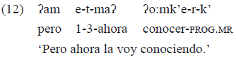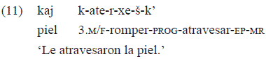 El verbo «xe:» ('pasar'), junto a «ate» ('romper') da lugar a la idea de 'atravesar'. En este caso, estamos frente a tres verbos, uno de los cuales, «r-» se halla gramaticalizado como sufijo aspectual. Es evidente que este sufijo proviene del verbo «re:» ('andar') que ha perdido sustancia fonética transformándose en un sufijo aspectual progresivo. El ejemplo 11 nos permite observar que las CSV habrían incluido hasta tres raíces verbales. En el ejemplo 12, observamos nuevamente el sufijo progresivo: