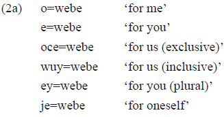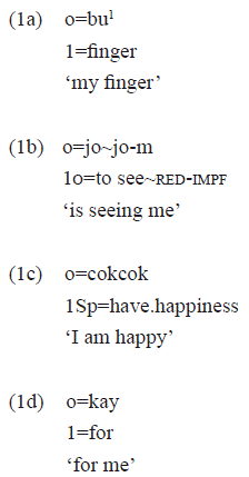 The example 1a shows the inalienable noun «-bu» 'finger' that obligatorily occurs with the person marker «o=» '1st person', indicating the possessor of the noun2. The paradigm of person marking of which «o=» is part, is also used to indicate the direct object of transitive verbs, such as in the example 1b, the subject of intransitive stative verbs3, as in the example 1c, and the object of postpositions, as in the example 1d.