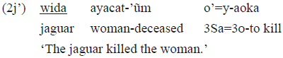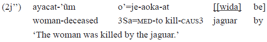 In the example 2j', the subject is «wida» 'jaguar' and it is the agent. The object is «ayacat'üm» 'woman' and it is the patient. The constituent order and the cross-reference markers in the verb indicate these grammatical relations. If the subject were a second person, for example, «wida» would be replaced by the pronoun «en» and, in the verb, the cross-reference marker of subject would be «e=», a singular second person clitic. Next, a passive construction is presented in order to contrast it with the active 2j':