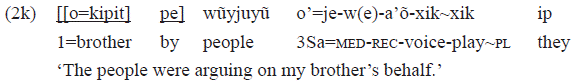 In the example 2k, the verb «a'õxik» 'to argue' was intransitivized by the prefixes of middle voice «je-» and reciprocity «we-». The theme or interest of the argument occurs in a PP. Also, we analyze this pp here syntactically as an adjunct, but semantically as an important participant.