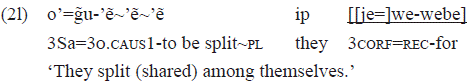 In order to express reciprocity, besides the verbal construction «je+we+transitive .verb» as in the example 2k, it can use a postpositional phrase. In that case, the transitivity of the verb is kept, and the reflectivity/reciprocity prefix «we-»7 in the postposition occurs: