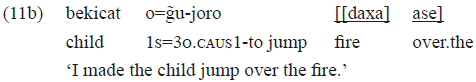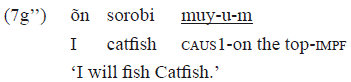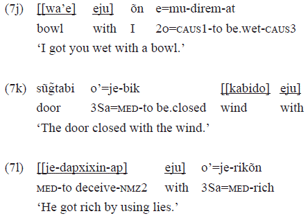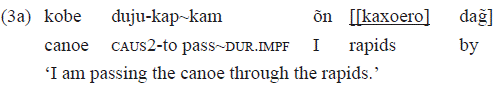 In the example 3a, the intransitive verb «kap» 'to pass' was transitivized by the causative prefix «duju-» that is responsible for introducing an argument in the predicate. In this case, the argument was «kobe» 'canoe', with a grammatical relation of object. This causative prefix, particularly, is used with intransitive verbs for building a comitative sense: the object is interpreted as a company of the subject. For more details, see Gomes (2006, 2014).