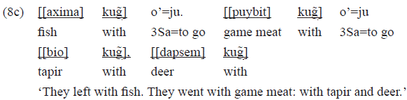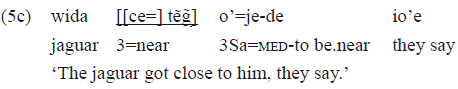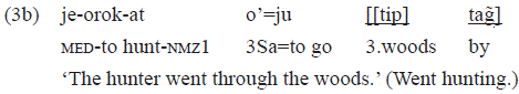 The example 3b shows an intransitive verb where the subject is «o'=» 3Sa. The pp that occurs there also is an adverbial-nature adjunct, expressing diffuse locative: «[[tip] tag̃]» 'through the woods':