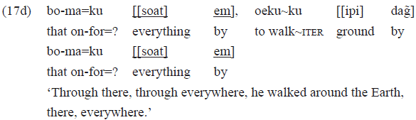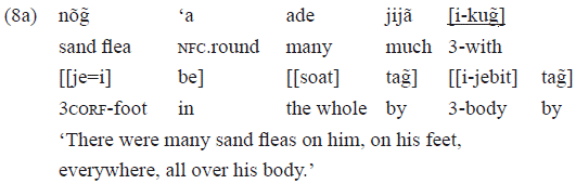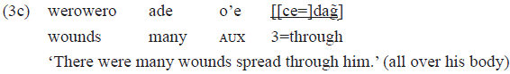 Finally, the example 3c includes a PP with the function of head of a locative predication, also with a diffuse sense also: «[[ce=] dag̃]» 'through him'.