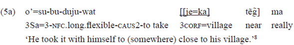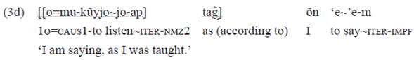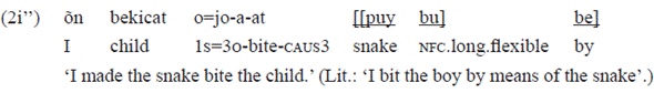 In this example, the PP «[[puy bu] be]» 'by the snake' functions, syntactically, as an adjunct, occurring in the final position, not finding space in the morphosyntax of the verb, which is filled only by the subject («o=» 1s) and direct object («jo-» 3o) arguments. However, the pp has the important semantic role of direct agent in the action. In the causatives constructed from transitive verbs, such as the example 2i'', the subject argument is reserved for the indirect agent (the causer), relegating the direct agent (the causee) to the syntactic space of adjunct. The pragmatic-discursive effect of this type of formal expression of the direct and indirect agent requires further explanation.
