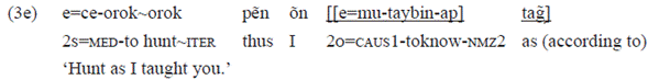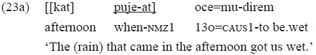 In 23a, the postposition «puje» has received the nominalizing suffix «-at» and started to function as noun phrase head that requires a complement, in the case «kat» 'afternoon'. Thus, the nominalized postposition started to perform the grammatical relation of subject (head) of the transitive-causative verb «mudirem» 'to get wet'14.