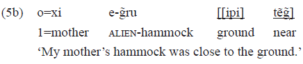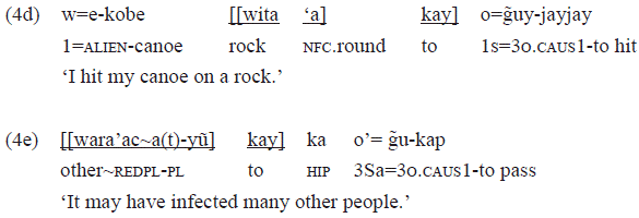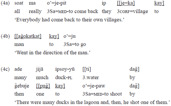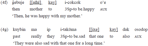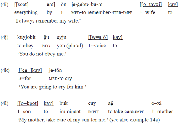 The PP headed by «kay» in the examples 4f, 4g, and 4h followed stative intransitive verbs, and these PPS have as complement, respectively: a noun («aĩhĩ» 'mother'), a free pronoun («ixe» 'him'), and a clitic personal pronoun («o=» 1). These verbs occur frequently without these PPS.