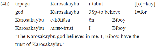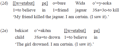 The verb «etabut» 'to believe' is a stative intransitive verb that occurs with a circumstantial led by the postposition «kay», typical of psychological verbs (cf. section 2.3.2). Nevertheless, in the examples 2d and 2e below, «etabut» was used nominally, as complement of the postposition «pe» This pp has a modality function: