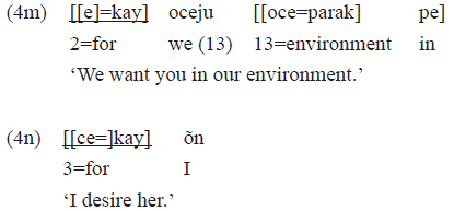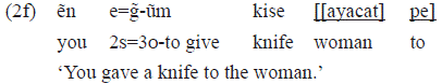 The verb «ũm» 'to give' requires, morphosyntatically, two arguments as we can see in the example 2f, namely: a subject («ẽn» 'You') and a direct object («kise» 'knife'). These two arguments keep a grammatical relation with the verb, morphologically, as they are retaken or identified in it by means of pronominal indexes: «e=» 2s and «g̃-» 3o. The beneficiary of the action («ayacat pe» 'for the woman') does not find space in the verbal morphology and occurs in a pp, typically in the final position in the sentence: