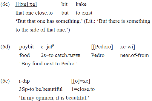 The example 6e illustrates another use of a PP as modality marker. The statement «idip» '(something/somebody) is beautiful' is modalized by the pp «[[o=] xe]». The literal meaning 'close to me' is used to the derived direction 'in my opinion', to express a subjective evaluation of what is being stated.