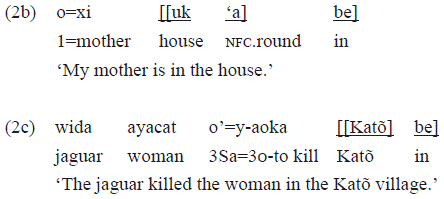 In the examples throughout this text, we will highlight the internal structure of the pp. In the example 2b, the pp «[[uk' a] be]» 'at the house' has the postposition «be» as head, and the noun phrase (NP) «uk 'a» 'house' is its complement. Pieces of evidence in favor of the identification of postpositional phrases such as these are: