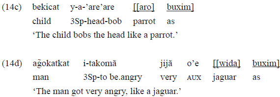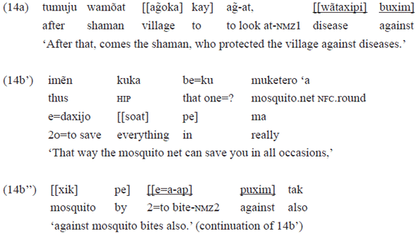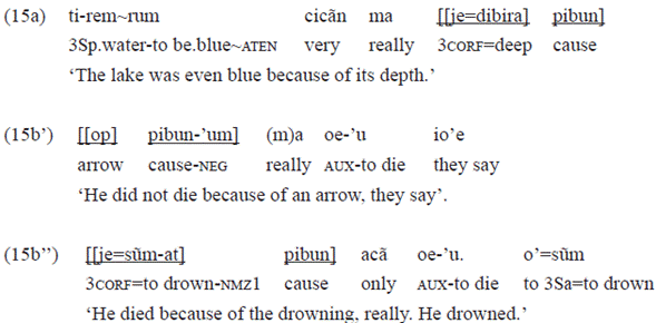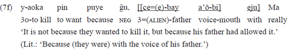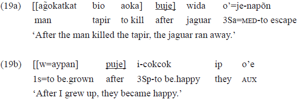 In the example 19a, the clause that functions as a complement of the postposition «buje» has neither a personal or a subject marker, nor one of object in the transitive verb «aoka» 'to kill'. These markers were expected, as they are typical of the perfective aspect, especially the subject marker. Therefore, there is an indication of less finitude in this clause, which is a complement of «buje», probably revealing the most nominal character of the clause.