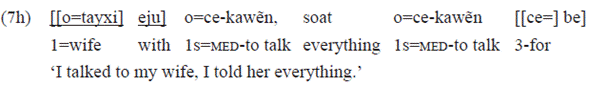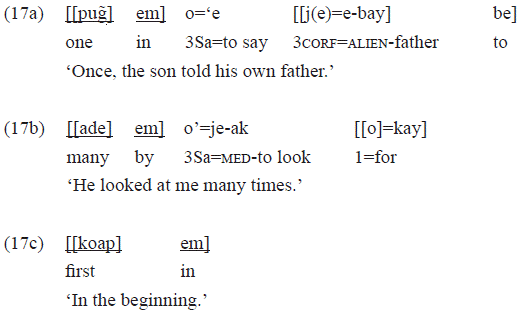 Regarding specifically the expression of non-co-referential third person, postpositions have greater affinity with alienable nouns. Both have the same personal marking: «ce=». While inalienable nouns (and a few postpositions) mark the third person with a prefix (nominal subclass I) or by means of the alternation of the initial consonant of the root of [d]/[n] for [t] (nominal subclass ii), alienable nouns and the majority of the postpositions indicate the third person by the clitic «ce=»: