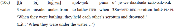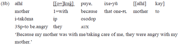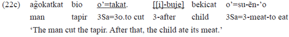 The example 22c below is also grammatical. In that case, the use of the person marker in the verb of the first clause («o'=takat») was only possible because the postposition was in the second clause. The postposition inflects for the 3rd person prefix («i-buje»), as already explained: