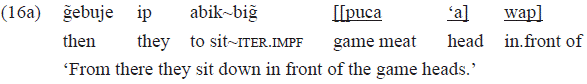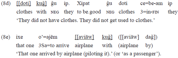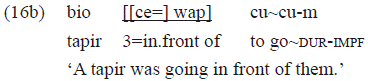 The example 16a includes an NP made up of two nouns as a complement of the postposition «wap», while the example 16b shows a clitic pronoun of non-co-referential third person («ce=»). Neither of the PPS is required by the argument grid of the verb.
