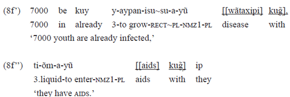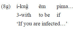 The example 4e was taken from a handbook on infecting communicable diseases and AIDS. The postposition «kay» was chosen to represent the idea of transmission of diseases from one body to another. Now the idea of being infected with the disease is expressed by the postposition «kug̃», which we will discuss in section 2.7.