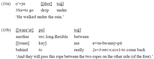 In the example 10c, the postposition «tog̃» is combined with the postposition «wi» used there with a directional value:
