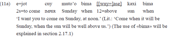 Although the very use of «bima» is quite frequent with clauses, such as in the examples 18a-c, we also find nouns as complements of pp headed by it. In the example 18d, this postposition has been used as such, in the sense of 'at the moment that (when)':