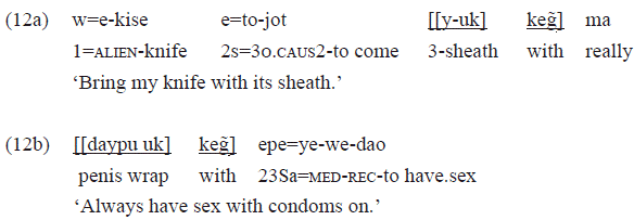 The example 12a illustrates the most common use of the postposition «keg», associated with casings of instruments such as knife sheaths. In turn, the example 12b shows a derived use, where «keg̃» was chosen to appear as guidance regarding the use of male prophylactics, also categorized as wrappings: «[[daypu uk] keg̃]» 'with condoms on'.