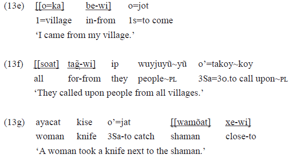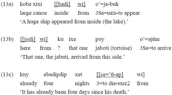 This combination of diverse postpositions with «wi», as may be inferred from the examples, is quite productive. The semantic value of origin in «wi» is responsible for this range of combinations.12