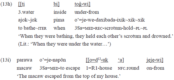 The postposition «wi», indicating direction, can be combined with other postpositions, such as «be» 'in' (example 13e), «tag̃» 'for' (example 13f), «xe» 'near' (example 13g), «tog̃» 'under' (example 13h) and «jeje» 'on' (example 13i):